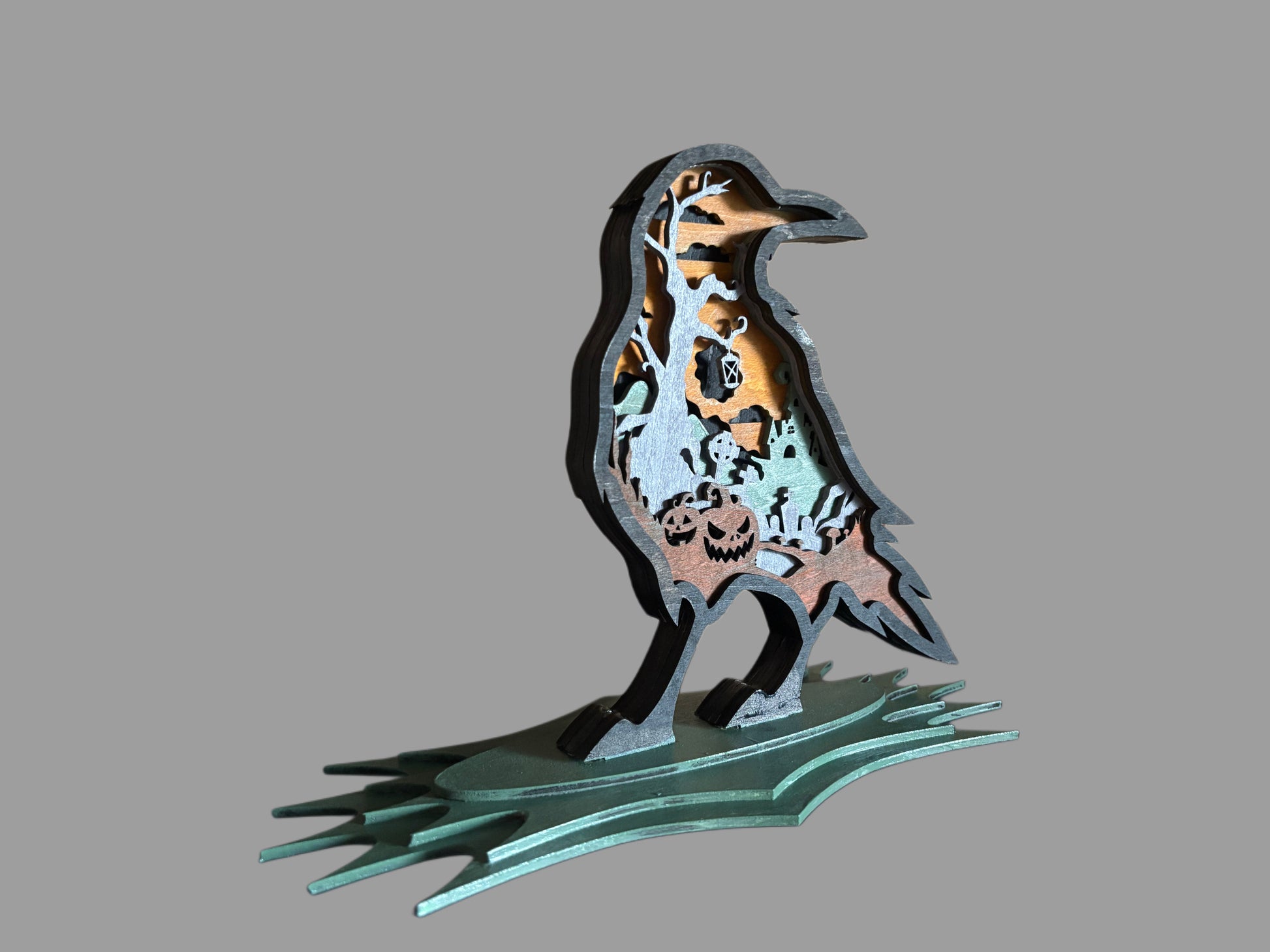 Crafted for Halloween ambiance, this Standing Crow features five intricately layered designs that create a striking, spooky effect. Measuring 7" by 6", the crow stands prominently on a sturdy base sized 9.75" by 4.25", ensuring stability and a bold presence in your seasonal décor. Its detailed construction adds depth and texture, perfect for enhancing festive settings with a touch of eerie elegance.